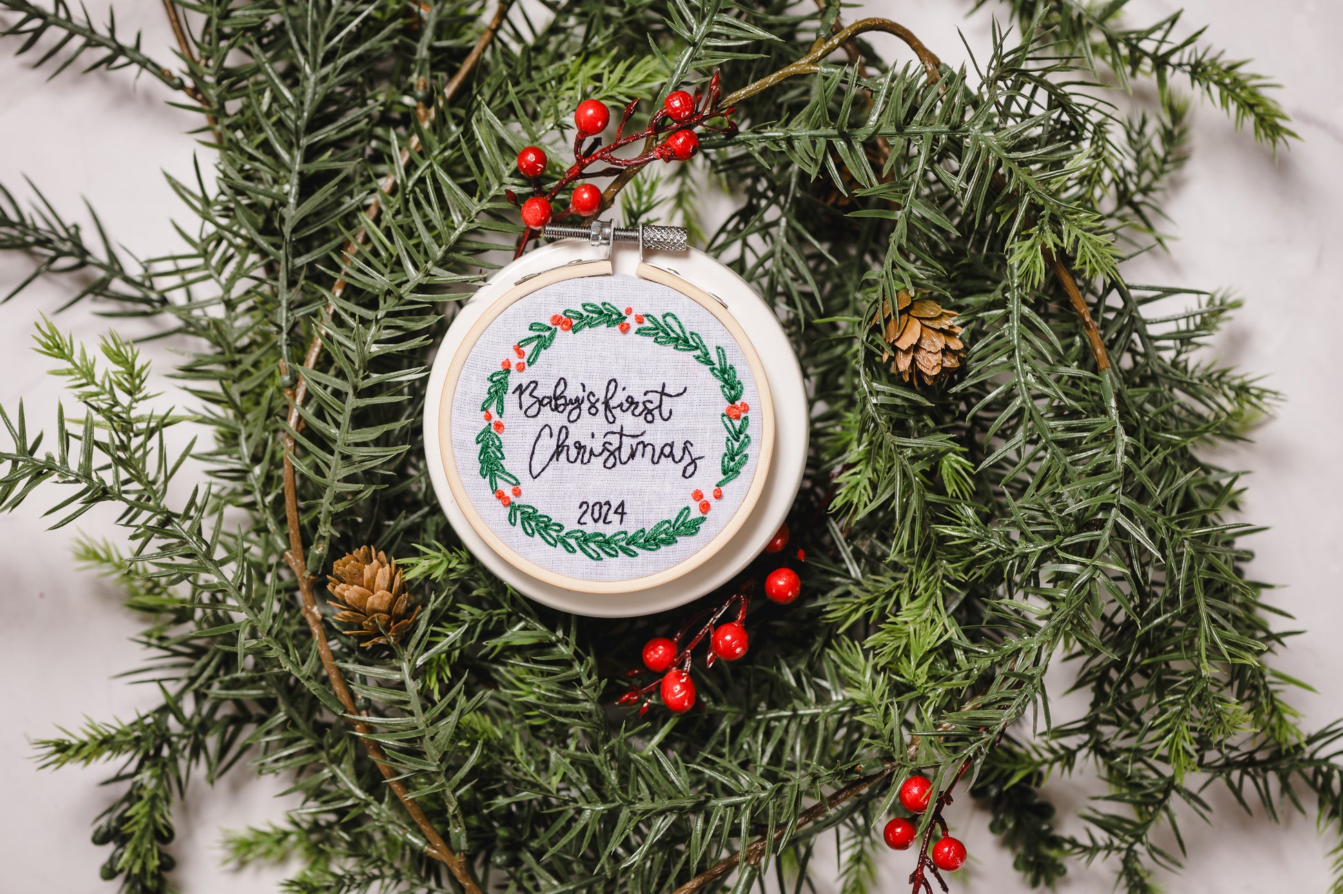 Hand stitched & custom made, these hoops are a precious keepsake for your new one! Stitched and framed in a 3'' embroidery hoop - perfect for the tree! Shade of green and red may vary slightly.